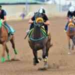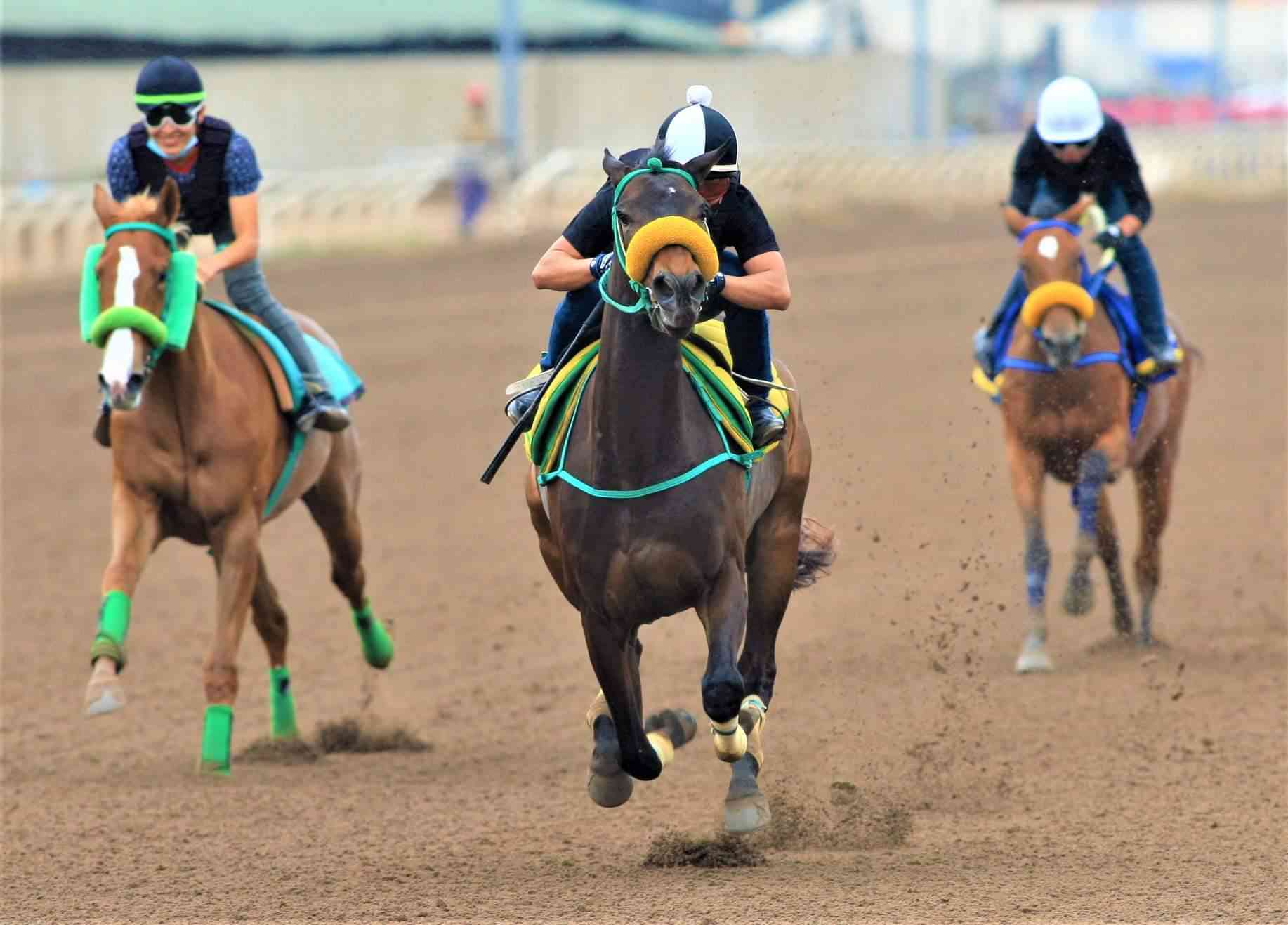 Aniversario (Ventocilla) en línea con el alazán, se empleó en 24″2 para los 400 metros, hijo de Yazamaan y Flyin And Flyout del Ocala.