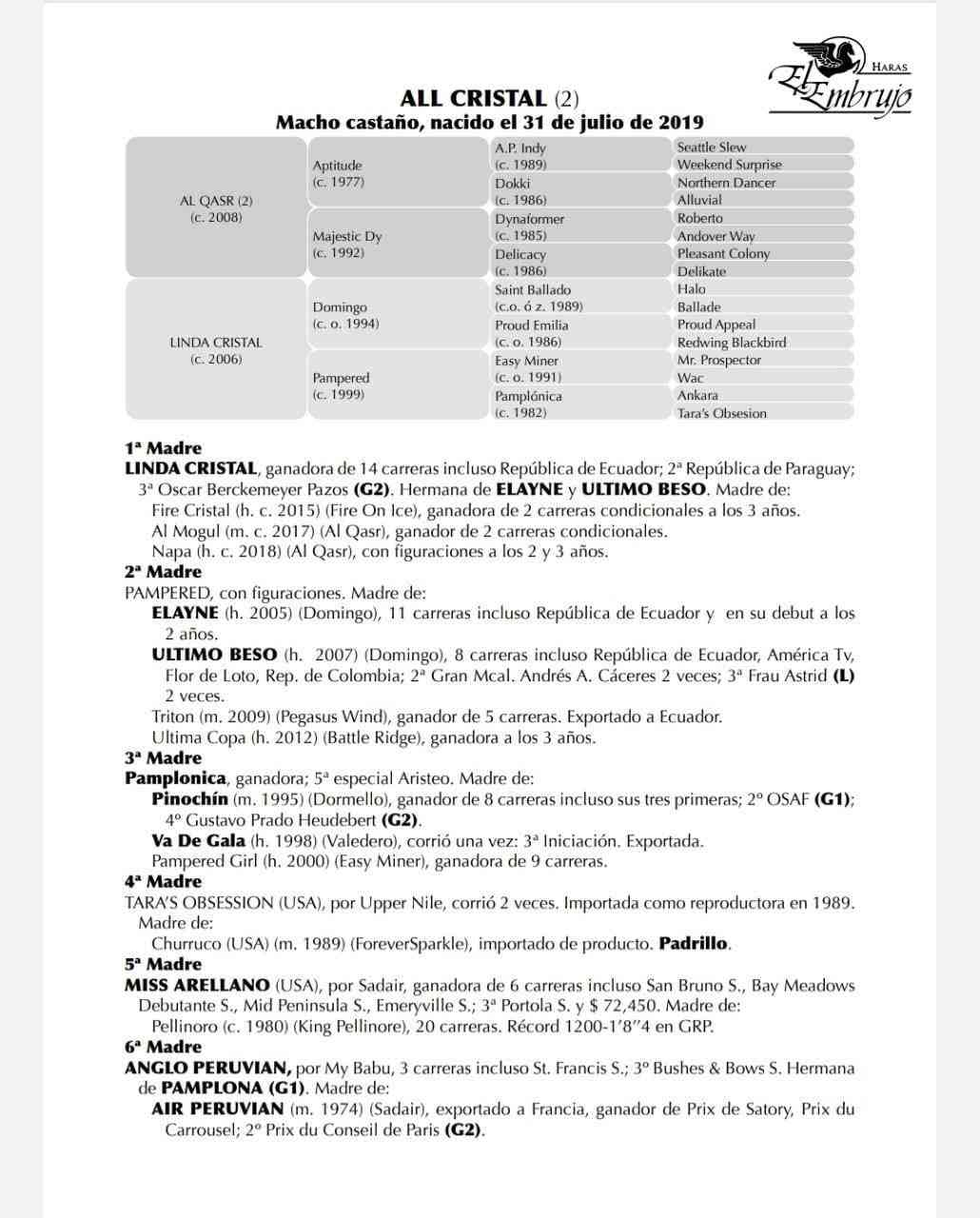Este preámbulo es para informar, además, que este sábado sale el lote de El Embrujo a subasta. Cinco productos y el único macho es un lindo hijo de Al Qasr y Linda Cristal. Su padre, todos los conocen en Monterrico, un nivel que sacó a relucir en la Argentina y Estados Unidos, con una línea baja que ofrece solidez para el fondo a través de Dynaformer. ¿Su madre? Ganadora de catorce carreras, con sobrado talento sobre el grass.