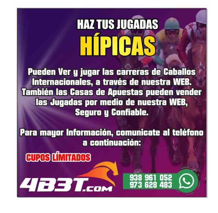 En www.4b3t.com, podrás obtener la señal en vivo de todos los hipódromos, los programas y revistas, todo al alcance de tu mano. Son cupos limitados, hazte nuestro cliente y te proporcionaremos la clave de ingreso. El contacto es a través de los WhatsApp 938 961 052 y el 973 628 483.
