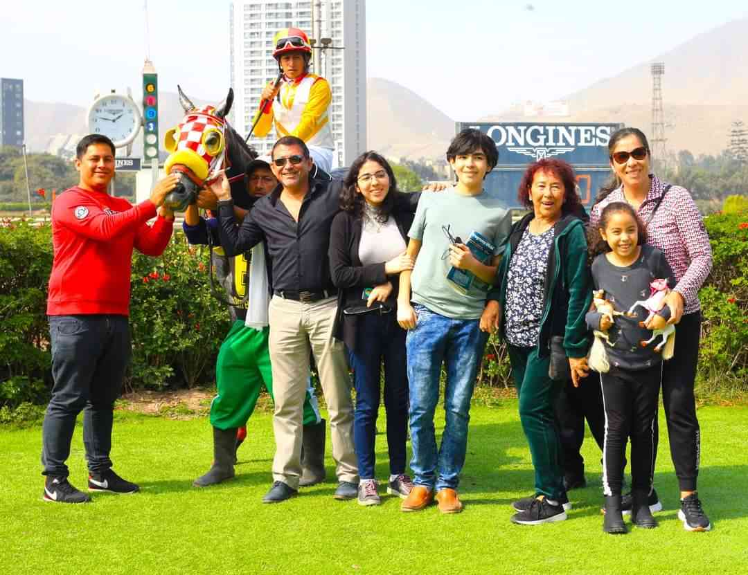 Gran alegría para su hípico propietario Sr. MARCO ANTONIO ROMERO BURGA, quien se retrata en compañia de su mamá Sra. MARÍA BURGA, sus hijos KAMETSA y BENIZIO ROMERO, su sobrina CATALINA TORRES, con el entrenado por GERARDO JULCA que desde que llegó el tordillo a sus manos lo ha transformado.