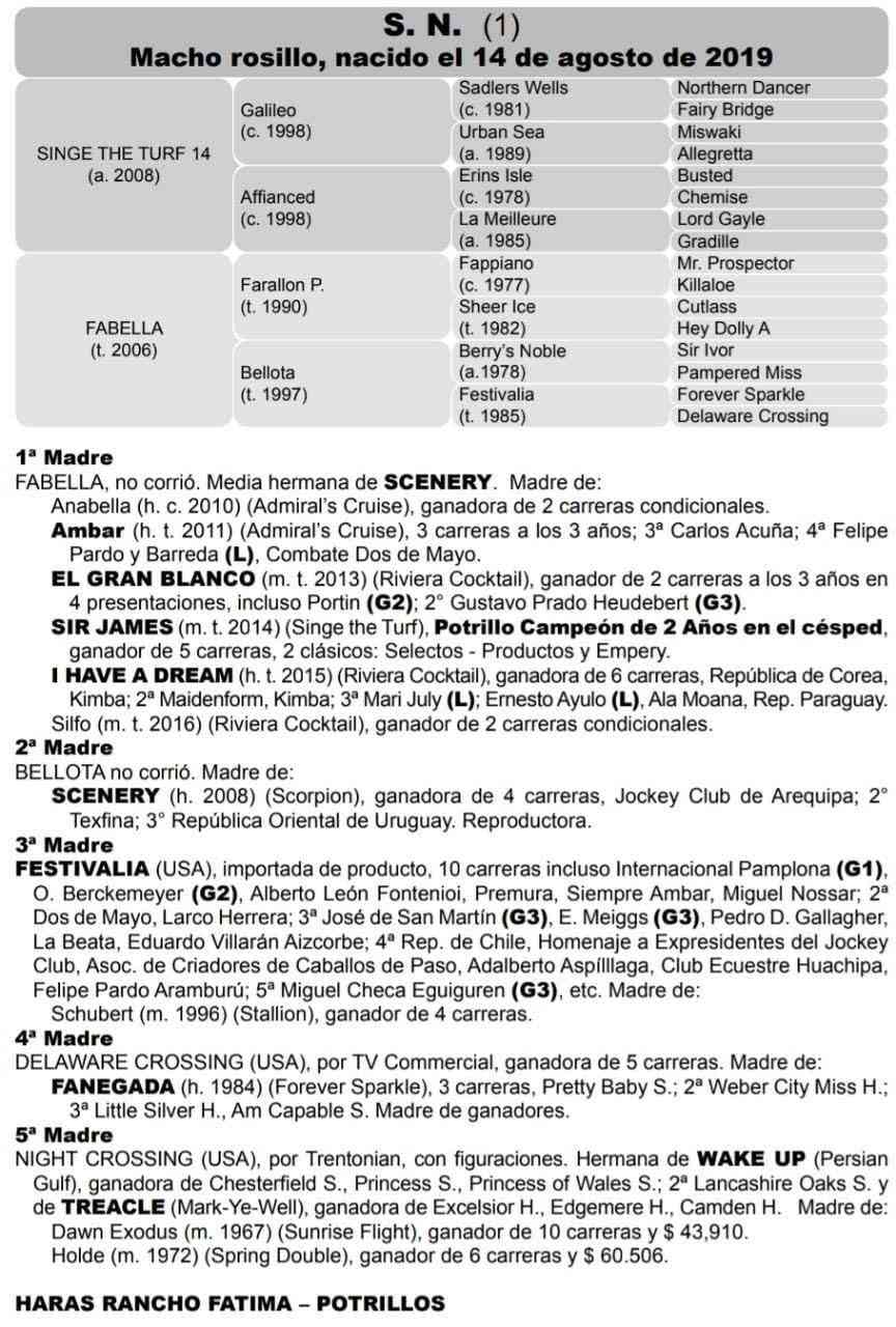 Se trata de un imponente tordillo hijo de Singe The Turf (Galileo) y Fabella (Farallón P). Una línea segura, pues su madre también ha ofrecido otros ganadores clásicos como El Gran Blanco y I Have I Dream.