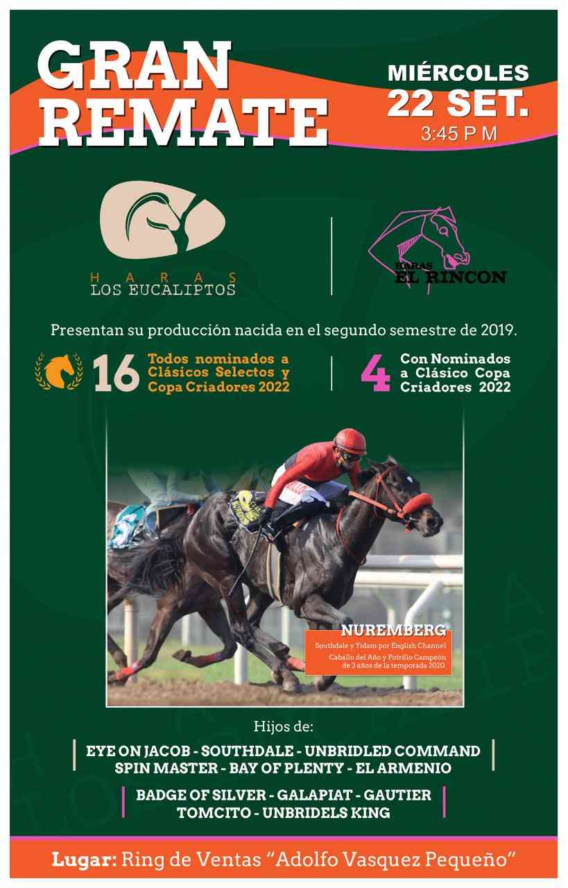 Los Eucaliptos trae a remate 16 productos, todos nominados al Selectos, el próximo 22 de septiembre. El lote incluye a cuatro hijos de Eye On Jacob, así que a ponerles el ojo en procura de un caballo productivo para probar suerte la temporada entrante.