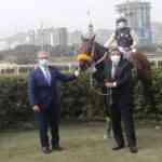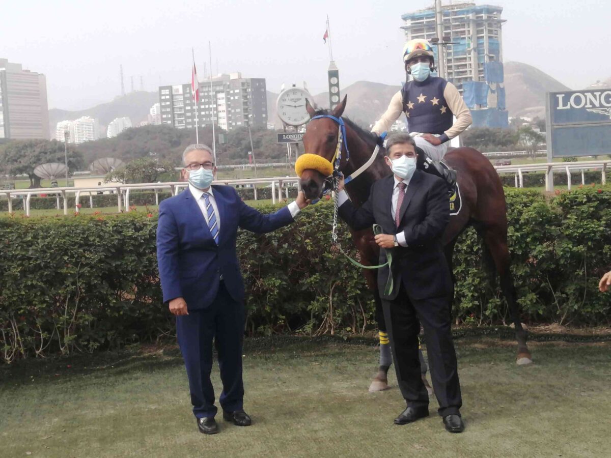 El hijo de Power Word en el herraje, sostenido por Rodolfo Castellano, dueño, y Alejandro Aguinaga, presidente del JCP