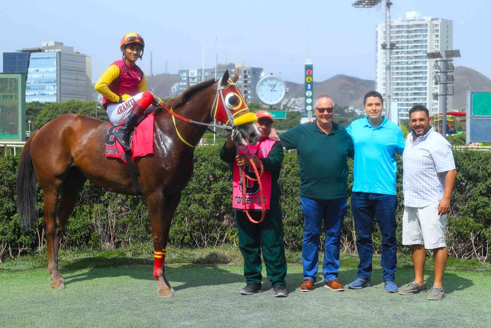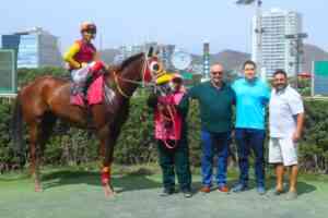 De vuelta al kilómetro, distancia donde de 10 carreras ha ganado en 6 ocasiones el pupilo del stud The Fathers con la hábil conducción de Angel Menéndez, salió raudo de la gatera, a enseñar sus colores al frente del lote y con tranco parejo mantener posiciones al llegar a la meta con un cuerpo de ventaja, mostrando que seguirá dándole alegrías a su hípico propietario quien se retrata junto a su preparador Camilo Traverso y allegados con el lindo alazán.