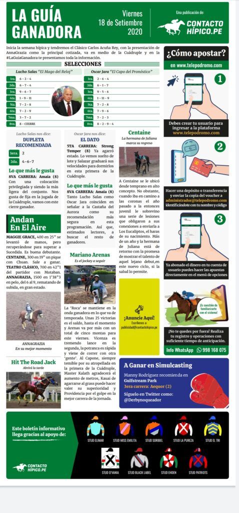 Este viernes disfrutaremos del Clásico Carlos Acuña Rey, encabezado por AnnaGrazia y otros yeguas destacadas. Esto será en medio de la apuesta de la Cuádruple y en la #GuíaGanadora nos encargaremos de colocarte en el dinero con los aciertos de Lucho Salas y Óscar Jara.