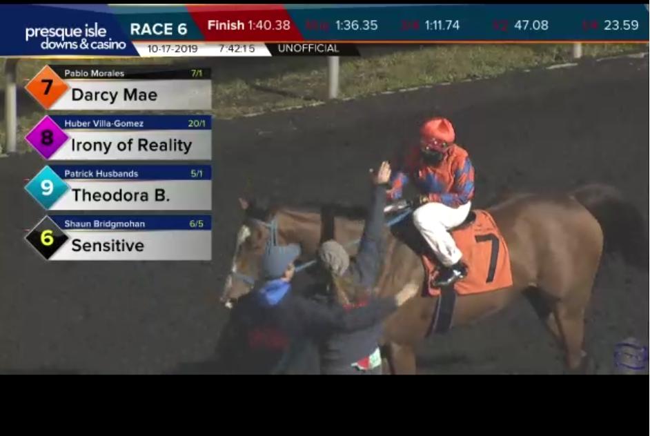 El jockey peruano Pablo Morales se lució con Darcy Mae en el H.B.P.A. Stakes (1664 metros, 100 mil $), este jueves, lo que marcaba además el último día del meeting de Presque Isle Downs. En la carrera reservada para yeguas de 3 y más años, Morales trajo a Darcy Mae en persecución de la outsider Dynamic War hasta que pudo desplazarla a mitad de la recta decisiva para soportar el acoso de Irony Of Rality con otro peruano Huber Villa Gómez.