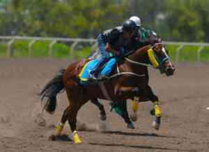 Carry To Craf (Arenas) 800 en 52″ su jinete parado en los estribos. Solo fue a rematar. 12″