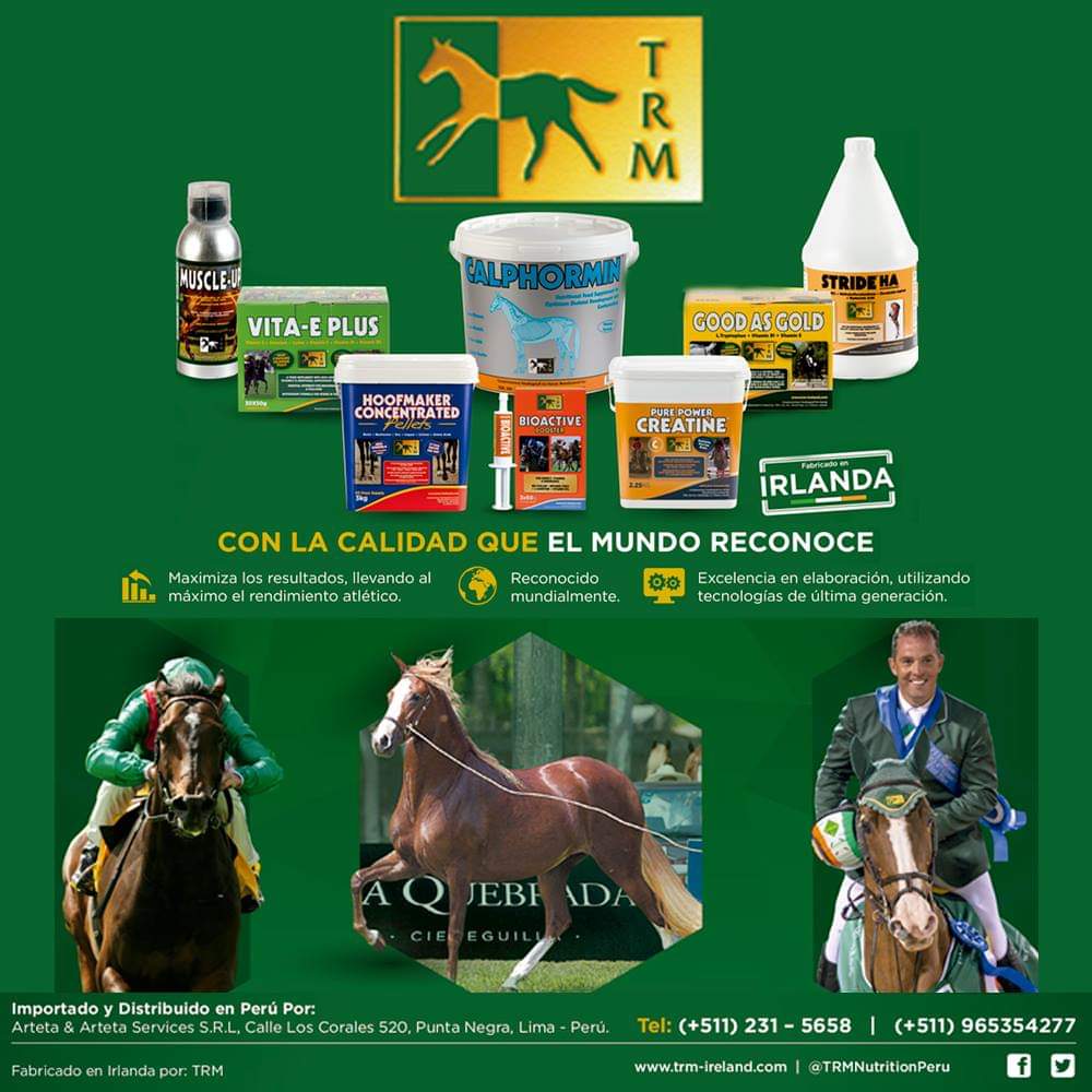 TRM el mayor fabricante de productos nutricionales y de alimentación con base en Irlanda ha sido distribuido en el Perú por Juan Pablo Arteta con resultados favorables, a juicio de los diversos entrenadores y propietarios que confían y evidencian las mejoras competitivas y regeneradoras en sus ejemplares. Productos como Stride, Pure Power Creatine,Vita E Plus, Calphormin forma parte de ese catálogo que maximiza los resultados llevándolos al máximo nivel atlético.