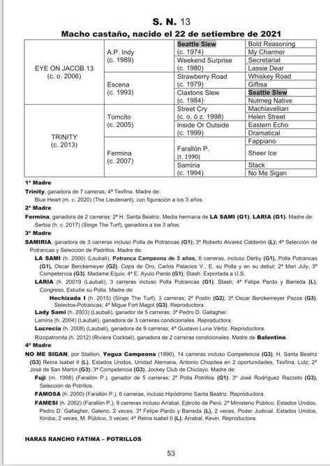En esta fecha de Remate Criadores, el Haras Rancho Fátima presenta un macho, hijo de Eye On Jacob y Trinity, con una línea materna a destacar. Trinity, ganadora de 7 carreras, con éxito en ambas pistas y un pedigrí que trae el recuerdo de ganadoras de Grupo 1 como Laria, Samiria y la campeona La Sami.
