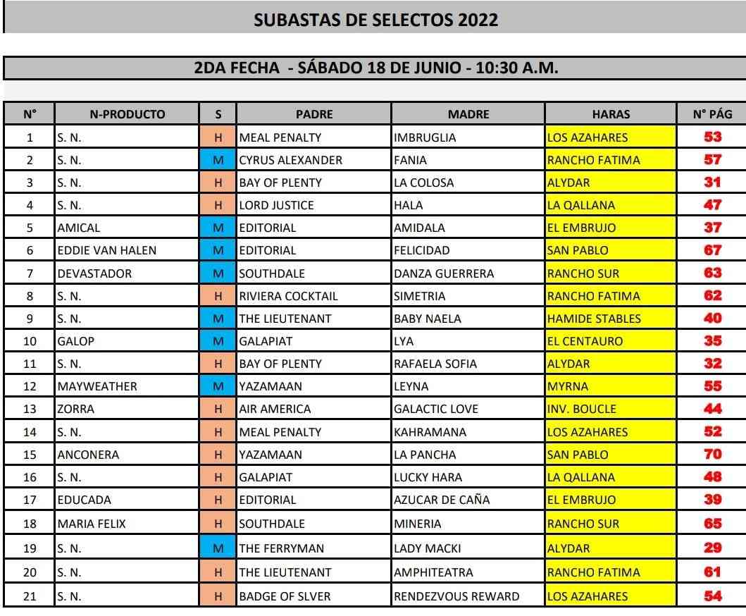 Con similares expectativas a la primera fecha, los haras nacionales ofrecen parte de lo mejor de su producción en esta segundo llamado de Selectos. La jornada será diurna, previa a las carreras en el Ring de Ventas Adolfo Vásquez Pequeño. Otros 21 juveniles serán ofrecidos, con el atractivo de que tendrán participación en la serie de carreras del mismo nombre que reparte más de 160 mil dólares cada año.